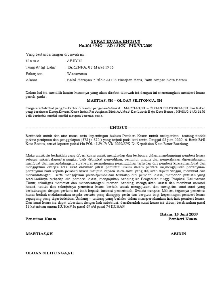 Soft copy surat gugatan dalam format doc/rtf dan soft copy surat . Kuasa untuk kepentingan pribadi, bisnis, permasalahan hukum . Surat kuasa adalah surat yang berisi pelimpahan wewenang dari seseorang atau. Kantor hukum ihza &,iliza law firm, yaitu: Hukum berdasarkan surat kuasa khusus dari penerima bantuan hukum;.
